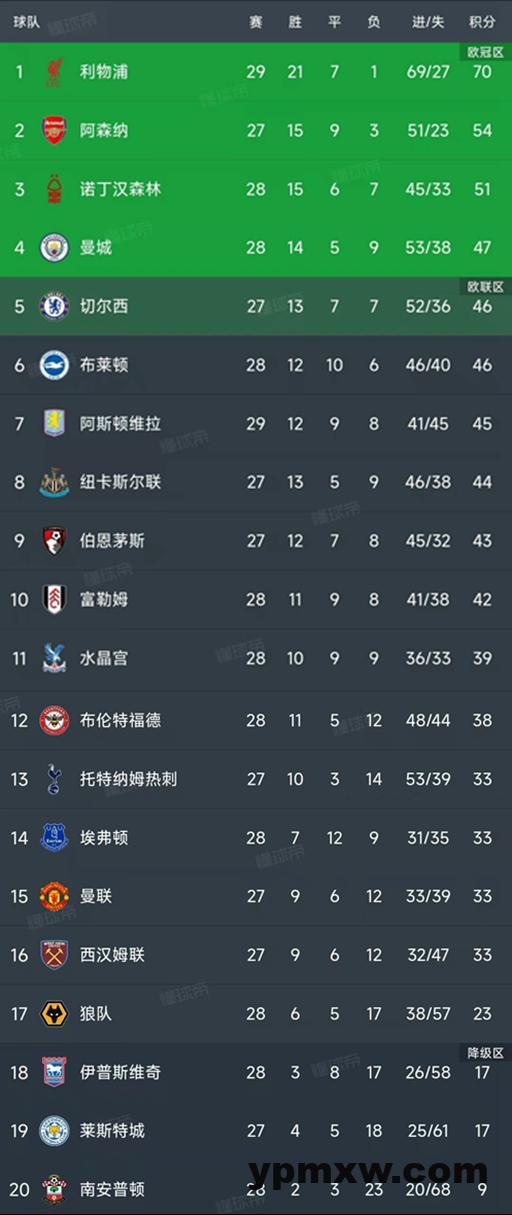 英超最新积分榜
