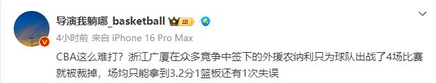 本赛季至今,农纳利一共代表浙江广厦出战4场比赛,对阵辽宁男篮拿到2分1篮板,面对浙江男拿到4分2助攻,对阵山西男篮5中2拿到5分2助攻,面对上海男篮拿到2分1篮板1助攻,另外还有4次失误,四场比赛场均只有3.3分1篮板1.3助攻的表现。事实证明,农纳利根本无法适应CBA高强度的对抗,在常规赛中都无法证明自己,到了身体对抗强度彻底拉满的季后赛,农纳利的表现只能是灾难级别,浙江广厦希望在季后赛开启之前摆出最强的四外援阵容,王博指导不希望浪费这次绝佳的争冠良机。