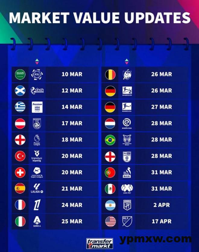 直播吧3月9日讯 德转公布3-4月各联赛球员身价更新时间,具体情况如下:
