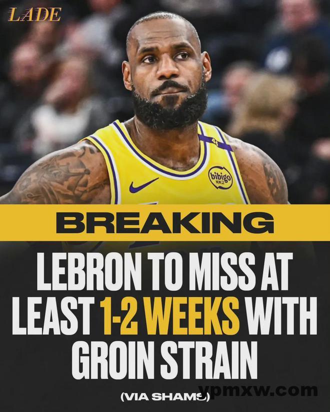 Shams:詹姆斯因腹股沟拉伤,预计至少缺阵1-2周。