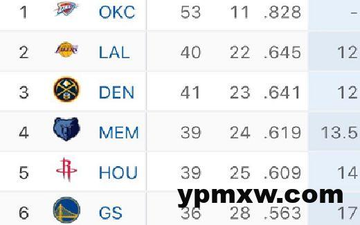 目前为止,湖人以40胜22负排名西部第……二,掘金与雷霆强强对话中103-127大比分落败,于是又下滑至第三位置。