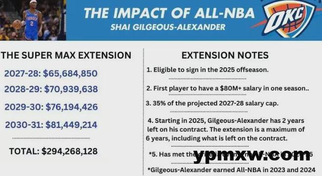 值得一提的是,据薪资专家Marks表示,不出意外的话亚历山大将在今夏与雷霆签下为期四年总价值高达2.93亿美元的续约合同,平均年薪7325万美元,最后一个赛季(30-31)8145万美元,使他成为NBA史上首位年薪超过8000万美元的球员。