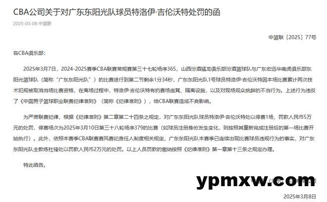 吉伦沃特在上一场对阵山西的比赛中,因抱怨裁判被连续吃了两个T,驱逐出场后又对山西球迷做出不冷静的举动,被CBA公司处于一场禁赛,5万罚款的处罚。杜锋作为教练员被罚款2万。