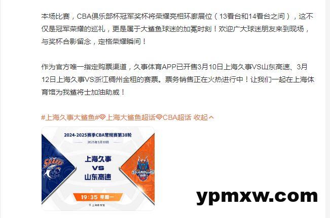 据悉,这场比赛还有一个特殊环节。上海男篮官微在预测这场沪鲁大战时这样表示:此番交锋,希望我鲨立足防守,减少不必要的失误,力争在主场延续连胜的步伐。官微还透露,上海队对阵山东男篮的这场比赛,CBA俱乐部杯冠军奖杯将荣耀亮相环廊展位(13看台和14看台之间),现场观战的球迷朋友可以与奖杯合影留念。