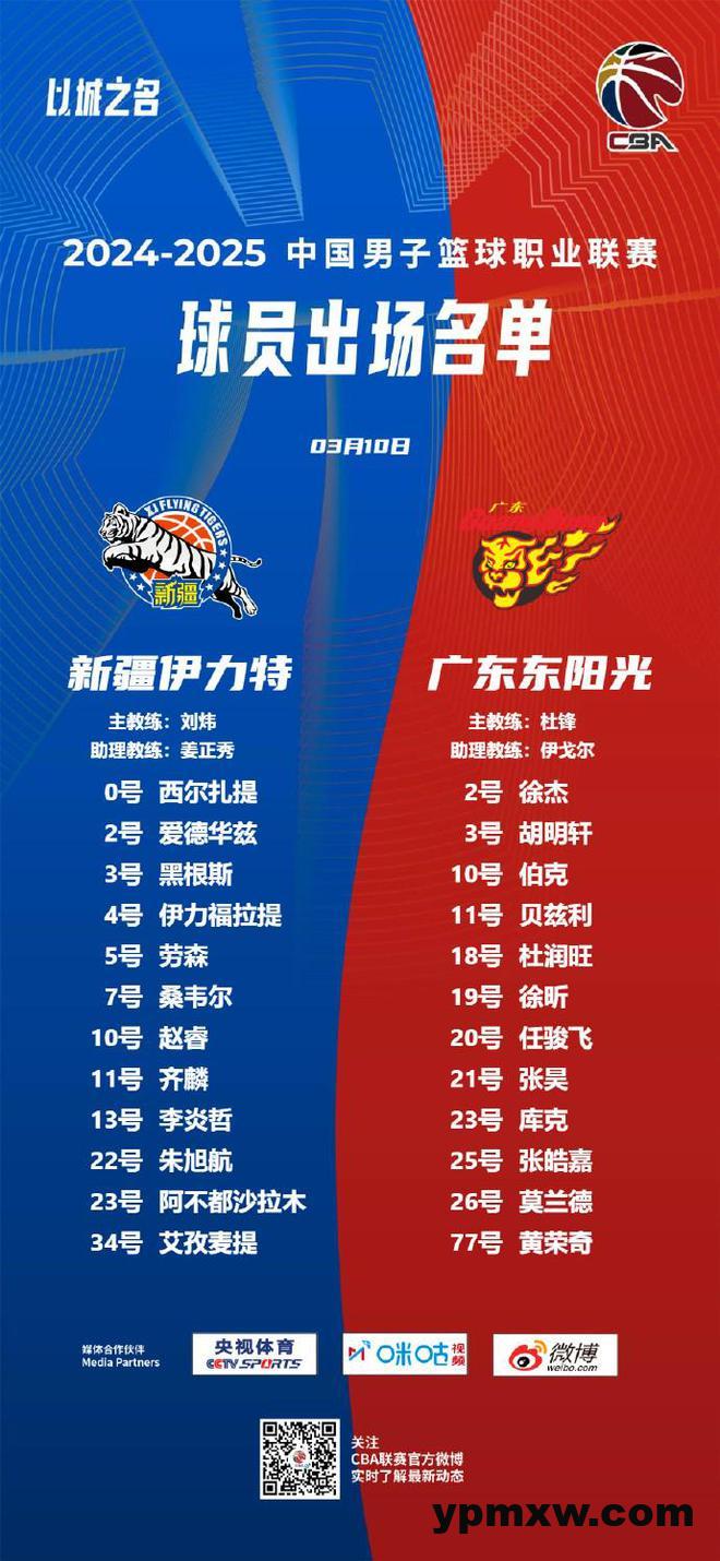 北京时间3月10日20:00,CBA常规赛新疆男篮将在主场迎战广东男篮,本场比赛的大名单已经公布。