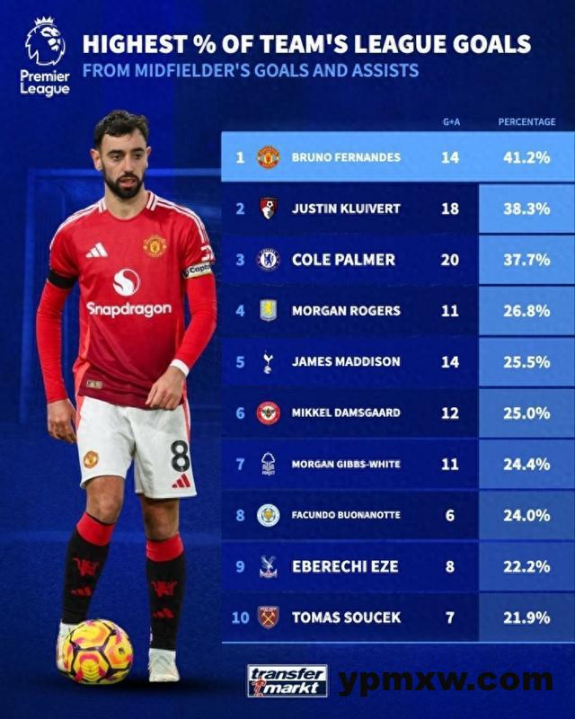 直播吧3月10日讯 《转会市场》统计了本赛季英超中场球员参与全队联赛总进球的比率,B费独占榜首。