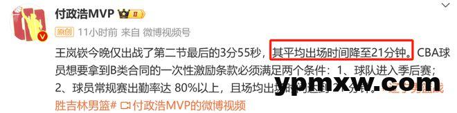 在本轮辽篮大胜吉林的比赛中,王岚嵚全场只打了3分钟,1投0中没有得分入账。随后媒体人付政浩也发文解析此事,他表示王岚嵚本赛季的场均上场时间已经降至21分钟,CBA球员想要拿到B类合同的一次性激励条款必须要满足两个条件:一个是球队进入季后赛,另一个则是球员常规赛出勤率要达到80%以上,且场均上场时间要达到21分钟。而刚好王岚嵚的场均上场时间卡在21分钟的门槛上,很难不让人猜测是辽篮方面有意为之。