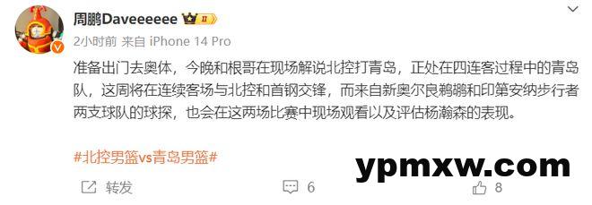 赛前媒体人周鹏爆料,NBA鹈鹕队与步行者队的球探会在北控VS青岛的比赛中评估杨瀚森的表现。在一周之前ESPN最新的选秀预测杨瀚森排在第77位。