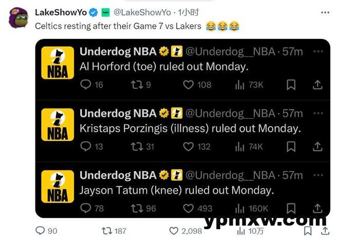 今日战爵士,塔图姆、霍福德、波尔津吉斯都不打,其中塔图姆和霍福德出战了上一场跟湖人的比赛。 KY体育新闻中心 KY体育·(中国)官方网站新闻中心 电讯报:切尔西、诺丁汉森林的老板可能推迟欧洲多俱乐部计划 马卡:勒沃库森希望阿隆索留下但他依然不表态,皇马同样不着急