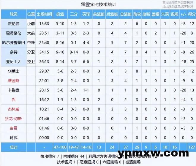 数据点评:半场4中3得7分1篮板2助攻,正负值-5!把握了空位机会,全场10中6得16分5篮板7助攻,正负值+2!第四节三分杀死比赛,赢球功臣!