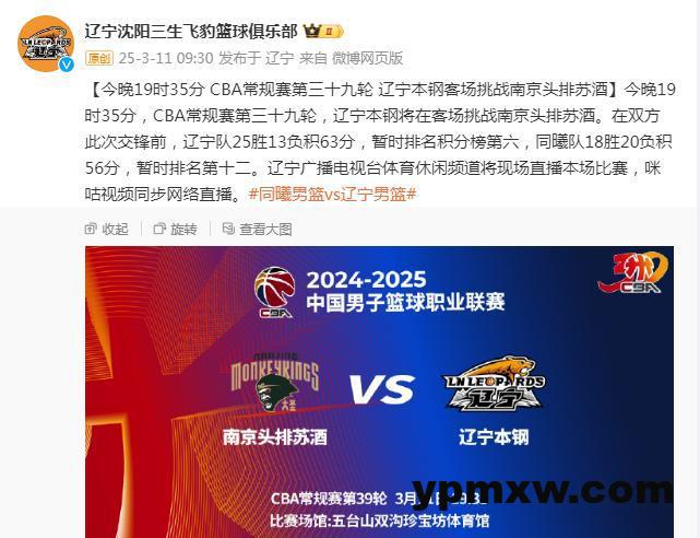俱乐部发文表示:今晚19时35分,CBA常规赛第39轮,辽宁本钢将在客场挑战南京头排苏酒。在双方此次交锋前,辽宁队25胜13负积63分,暂时排名积分榜第六,同曦队18胜20负积56分,暂时排名第十二。辽宁广播电视台体育休闲频道将现场直播。