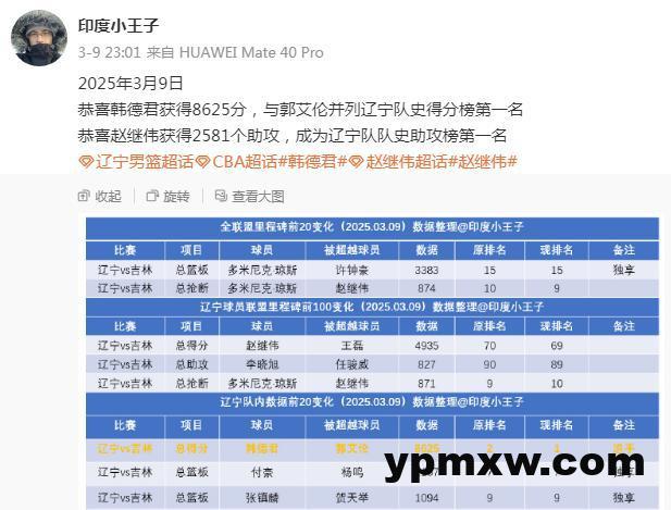 上轮比赛之后赵继伟拿到2581个助攻,成为辽宁队队史助攻榜第一名,而韩德君获得8625分,与郭艾伦并列辽宁队史得分榜第一名。因此此次与南京的比赛,两人只要出战得分和助攻数量增加都会进一步创造队史新纪录,期待他们有更加精彩的表现。