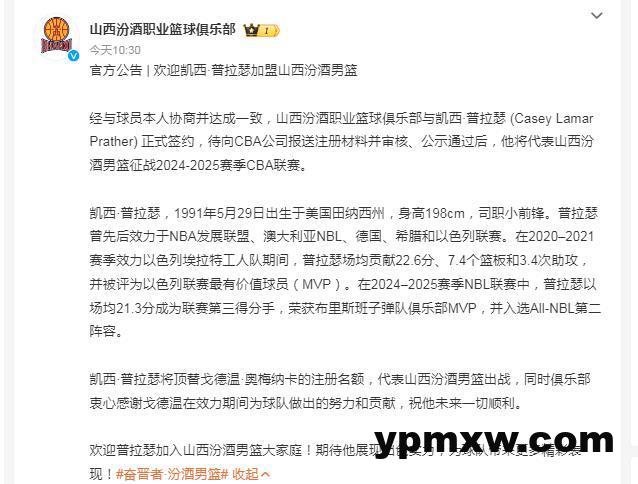 11日,山西男篮正式官宣澳洲NBL布里斯班子弹队的头号得分手凯西-普拉瑟加盟球队,他将身披22号战袍为山西队出战,正式裁掉了外援戈德温,普拉瑟今年34岁,是子弹队头号得分手,具有极强的得分能力,与广东队外援库克是队友,普拉瑟比他更厉害。