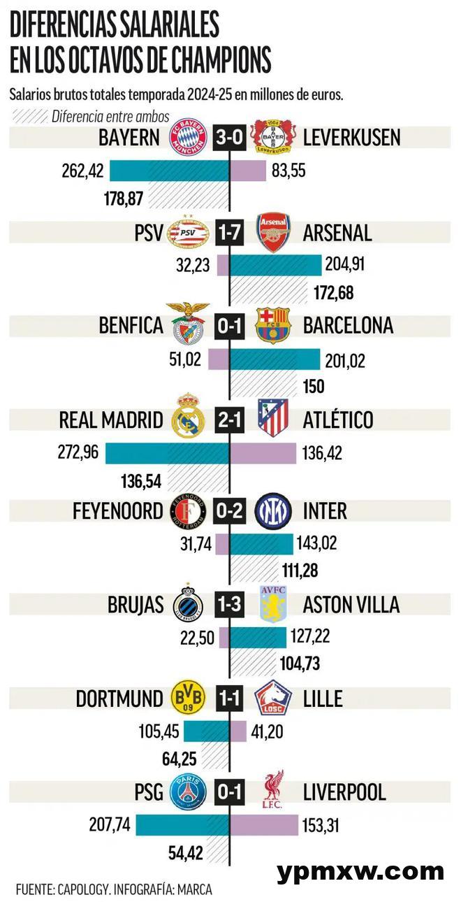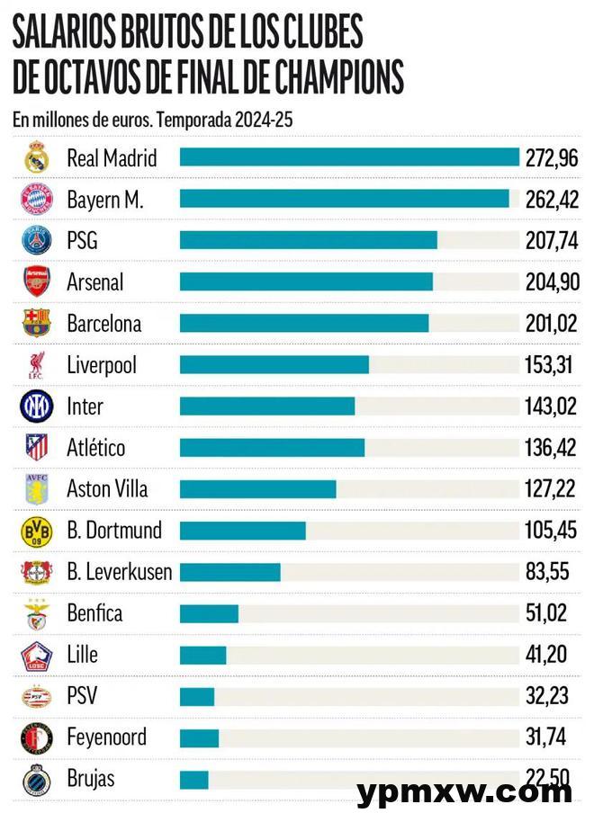 尽管经济实力并不一定保证竞技成功——过去十年曼联便是例证——但财务差距显而易见。八强俱乐部的平均年薪支出为1.298亿欧元,但最高支出者皇马(2.729亿欧元)与最低支出者布鲁日(2250万欧元)之间的差距达到12比1。