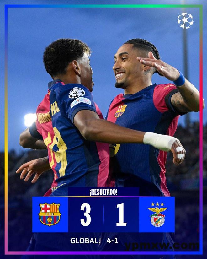 欧冠1/8决赛,巴塞罗那首回合客场1-0击败本菲卡,次回合主场3-1取胜,双杀对手晋级八强。