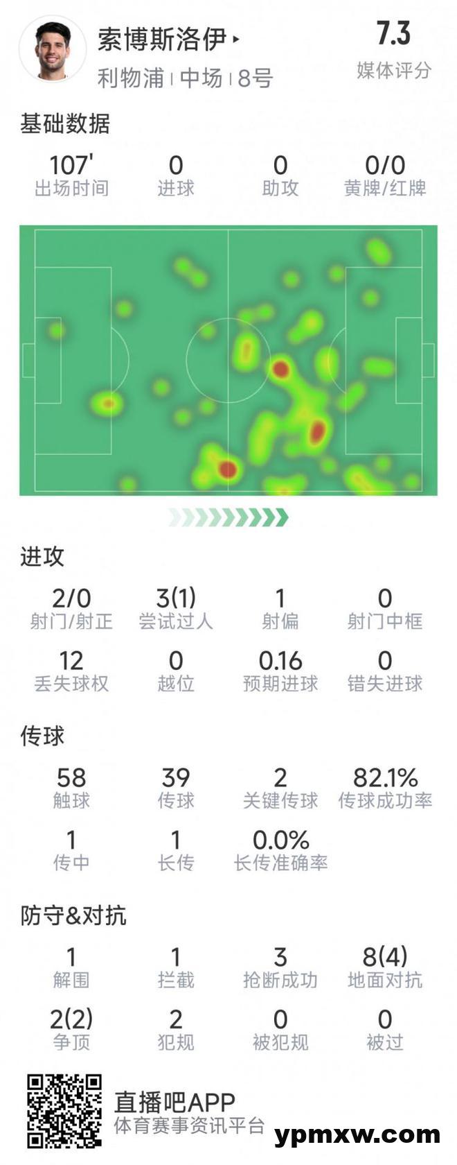 直播吧3月12日讯 在本轮欧冠利物浦对阵巴黎的比赛中,索博斯洛伊首发出战,以下为他在本场数据: