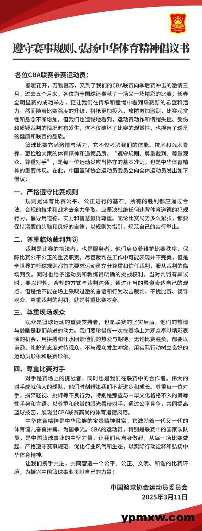 直播吧3月12日讯 今天,中国篮协官方发布了《遵守赛事规则、弘扬中华体育精神倡议书》,全文如下: