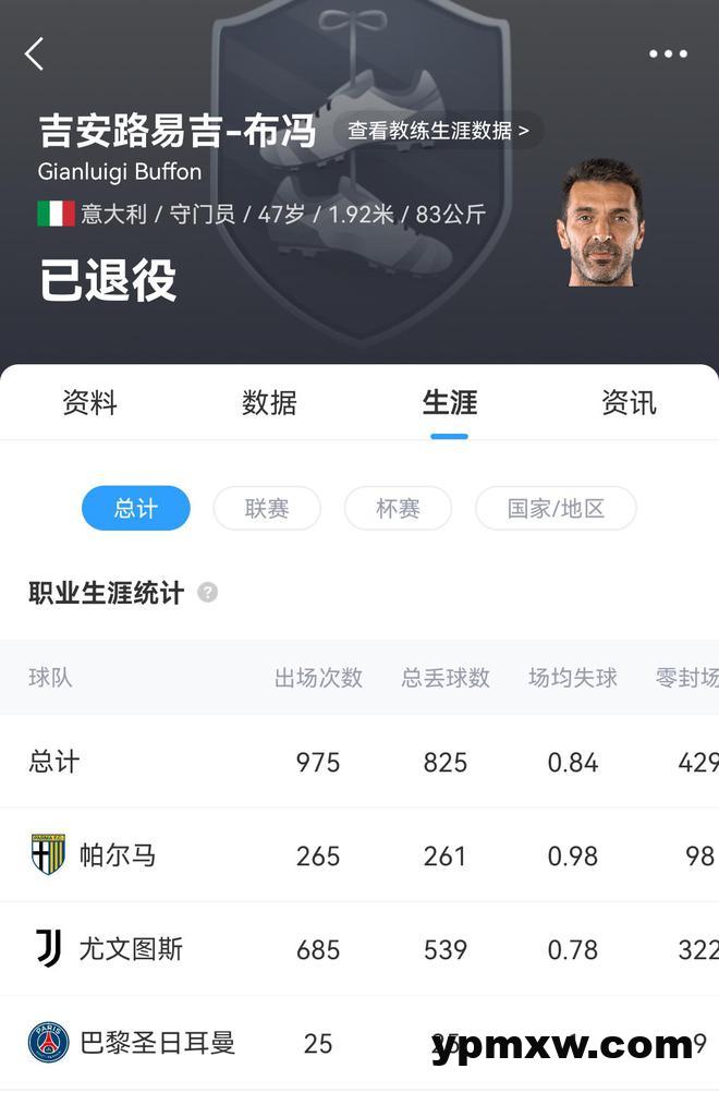 2023年8月45岁的布冯宣布退役时,他的俱乐部出场数达到了975场,国家队出场数达到了176次。