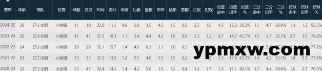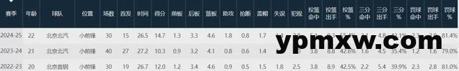 本赛季至今,曾凡博场均出战26.5分钟,砍下14.7分4.6板1.8助1.7帽,两项命中率55.4%与43.1%,真实命中率69.7%位列联盟第四,有效命中率66.5%高居联盟第三。