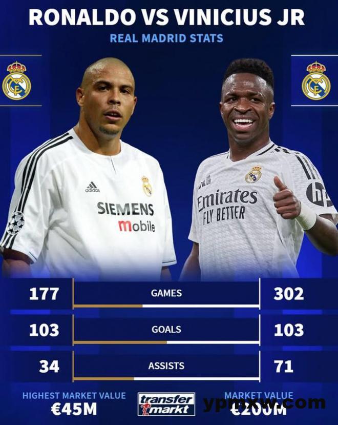 罗纳尔多为皇马出战177场,贡献103球34助攻,巅峰德转身价4500万欧。维尼修斯则在302场为皇马贡献103球71助攻,巅峰德转身价2亿欧。