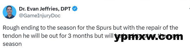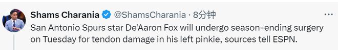 医学专家Jeffries表示,对于马刺队来说,这是一个糟糕的赛季收尾。不过通过肌腱修复手术,福克斯将休战3个月,预计在下个赛季开始时回归赛场。