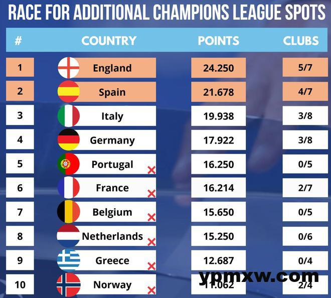 24/25赛季各联赛欧战积分(前2名获额外欧冠名额):