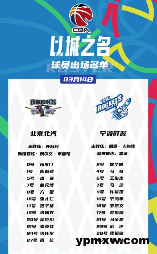 雷速体育3月14日讯 CBA常规赛继续进行,北京北汽坐镇主场迎战宁波。赛前,两队大名单已经出炉,以下是大名单具体情况: