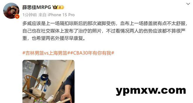据媒体人“薛思佳MRPG”报道,多威应该是上一场隔扣琼斯后的那次崴脚受伤,血布上一场膝盖就有点不太舒服,自己也在社交媒体上发布了治疗的照片,不过看情况两人的伤势应该都不算很严重,也希望两名外援尽早康复。