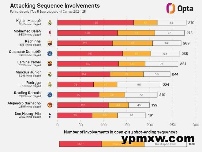 据Opta统计,皇家马德里前锋姆巴佩本赛季各项赛事参与279次以射门结束的进攻回合,为五大联赛前锋最多。