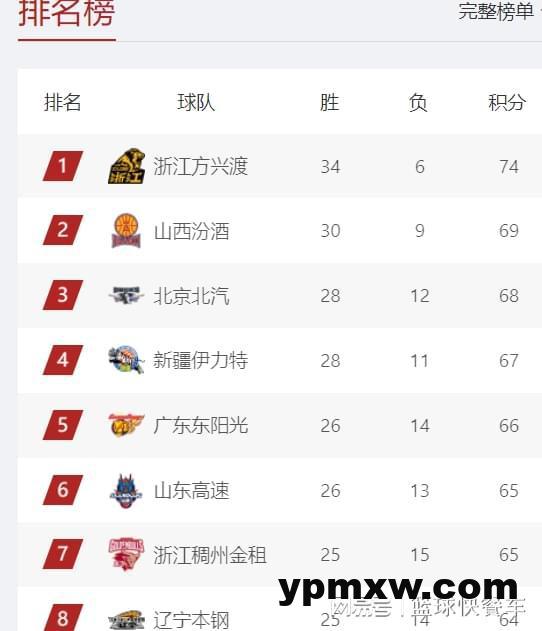 目前CBA积分榜上,广厦夺得常规赛第一名,已经没啥悬念了。在击败广东队以后,广厦的战绩变成34胜6负,领先身后的山西队4个胜场,在常规赛还只剩下6场的情况下,他们只需再赢下3场比赛,便可以锁定常规赛冠军了。而山西队第2名的位置,也是比较稳定的,他们以30胜9负,位居第二位。北京队最近状态不错,连战连捷,一波8连胜后,他们的战绩变成28胜12负,排在积分榜第三位。新疆队则绝杀了福建队,在少赛一轮的情况下,还是冲上积分榜前四。