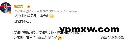 高诗岩更新社交媒体发文说道:“人心中的成见是一座大山,但是我不在乎!感谢邱导的支持,感谢山东队和我的所有队友们,更感谢一直支持山东队的球迷们。”