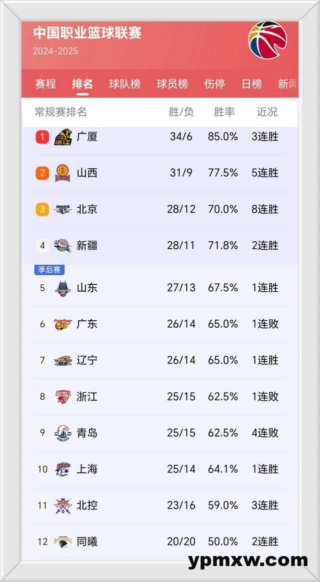 广厦榜首宝座不可撼动,山西队五连胜稳居第二,辽宁队虽然排在第八,但常规赛接近尾声,各队排名那是扑朔迷离,谁都有可能往上爬,谁都有可能掉下来,这比赛,真是越来越精彩了。