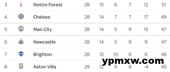 同时,曼城也在积分榜上被切尔西反超,以47分排名第5位,纽卡斯尔同积47分, 而布莱顿则以46分排名第7位。事实上,从排名第4的切尔西到排名第9的伯恩茅斯只差了5分,这让英超前五以及欧冠门票的竞争空前激烈。如果主场负于布莱顿的话,那么曼城将在积分榜上被布莱顿反超,这是一场真正的6分战。