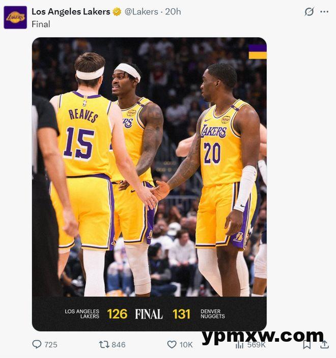 湖人126-131惜败丹佛掘金,这场比赛湖人第三阵容虽败犹荣,罚球16-38,加上掘金这边约基奇、穆雷、戈登、小波特四巨头都在,湖人仅仅只有一个里夫斯鏖战到最后一刻,关键时刻约基奇2+1与穆雷的决胜三分才为丹佛锁定胜局。