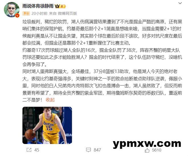 赛后中国名嘴徐静雨盛赞里夫斯:强大,全场最佳,37+13+8他是湖人这场绝对的老大,表现比约基奇强很多,关键时刻神之一手的抢断差点帮助湖人逆袭,佩服小里。