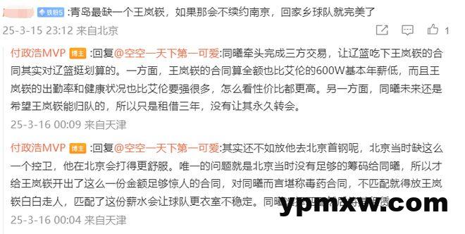 接着,付政浩又在评论区补充道:其实还不如放他去北京首钢呢,北京当时缺这么一个控卫,他在北京会打得更舒服。唯一的问题就是北京当时没有足够的筹码给同曦,所以才给王岚嵚开出了这么一份金额足够惊人的合同,对同曦而言堪称毒药合同,不匹配就得放王岚嵚白白走人,匹配了这份薪水会让球队更衣室不稳定。(所以)同曦选择匹配然后将其租赁(休赛期王岚嵚收到北京高达550万合同的报价,同曦被迫匹配)。