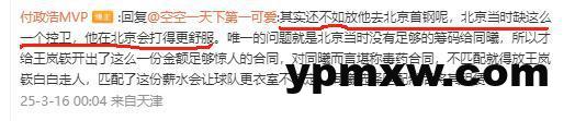 杨鸣如此操作,令媒体人付政浩也看不过去,他在社交媒体发文怒喷了杨鸣,他表示这场球若是让王岚嵚多打一些,会赢得更轻松,不会这么难看。他原话是这样说:“王岚嵚状态火热但出场时间依旧被精准把控,只打了19分18秒,场均时间被精准控制在20.6分钟。其实以他今晚的状态完全可以多打10分钟,辽篮会赢得更轻松”。他还为王岚嵚感到可惜,“CBA引入B类合同一次性激励条款本是好意,没想到却成了王岚嵚尽情发挥的阻碍,一声叹息!”付政浩还帮王岚嵚说话:若是去北京队就好了,当时北京正缺这么一个控卫,他在北京会打得更舒服”,付政浩如此同情地说。