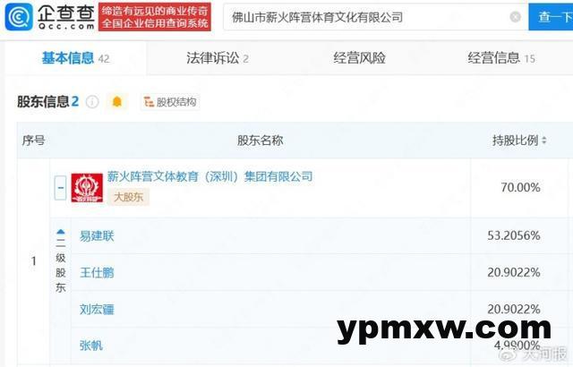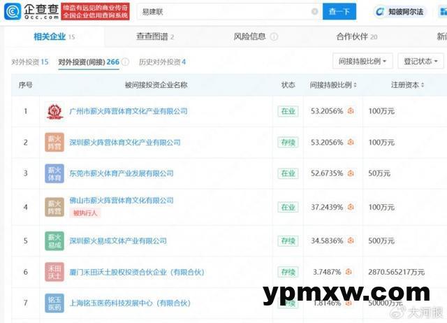 企查查APP显示,易建联关联15家企业,其中12家为存续状态,包括薪火阵营文体教育(深圳)集团有限公司、上海壹球成名信息技术有限公司等。此外,易建联间接持股企业超200家,行业涉及除体育文化外,还包括商贸、科技、投资等领域。今年2月,易建联关联企业佛山市薪火阵营体育文化有限公司成被执行人,执行标的约12万元。