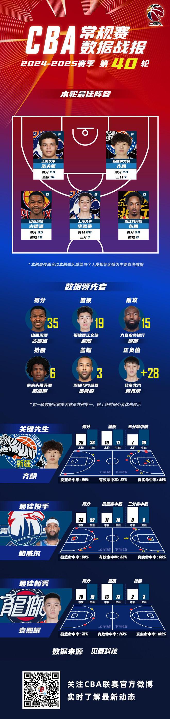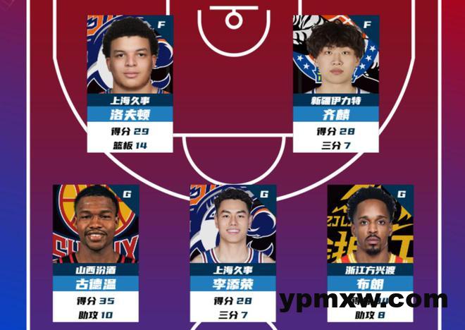 数据领先者方面,山西汾酒球员古德温以单场35分的数据领衔得分榜;
