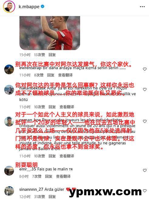 姆巴佩的社媒赛后成为居勒尔球迷的宣泄口,在姆巴佩置顶的加盟皇马推文中,大量土耳其球迷怒怼姆巴佩。
