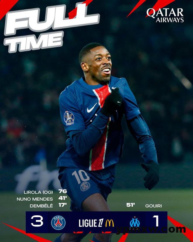 北京时间3月17日,在法甲第26轮的法国国家德比中,巴黎圣日耳曼依靠奥斯曼-登贝莱和努诺-门德斯的进球,外加对手的乌龙大礼主场3-1击败了马赛,目前以多达19分的优势领跑积分榜。