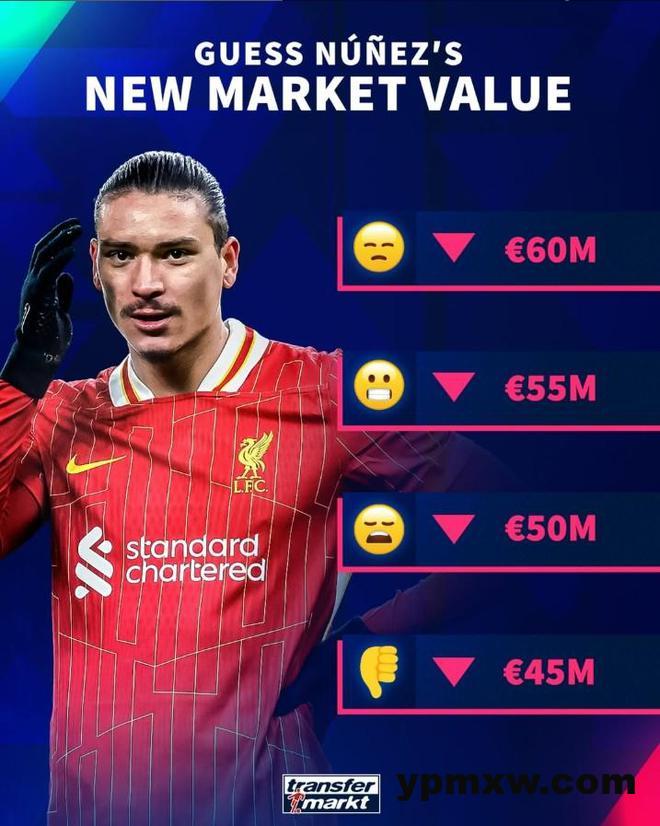 德转将在北京时间3月18日对英超球员身价进行更新,今日德转预热努涅斯身价下跌,最高6000万欧,最低4500万欧。