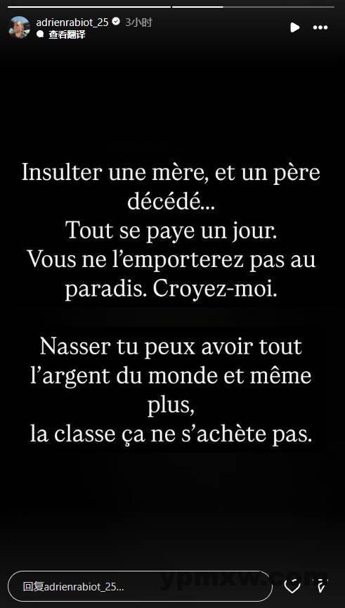 在周一凌晨进行的法甲第26轮法国国家德比中,巴黎主场3-1击败马赛,赛后第二天,拉比奥在社交媒体上发表动态,回应了巴黎球迷对自己的辱骂,同时表达了对纳赛尔的不满。