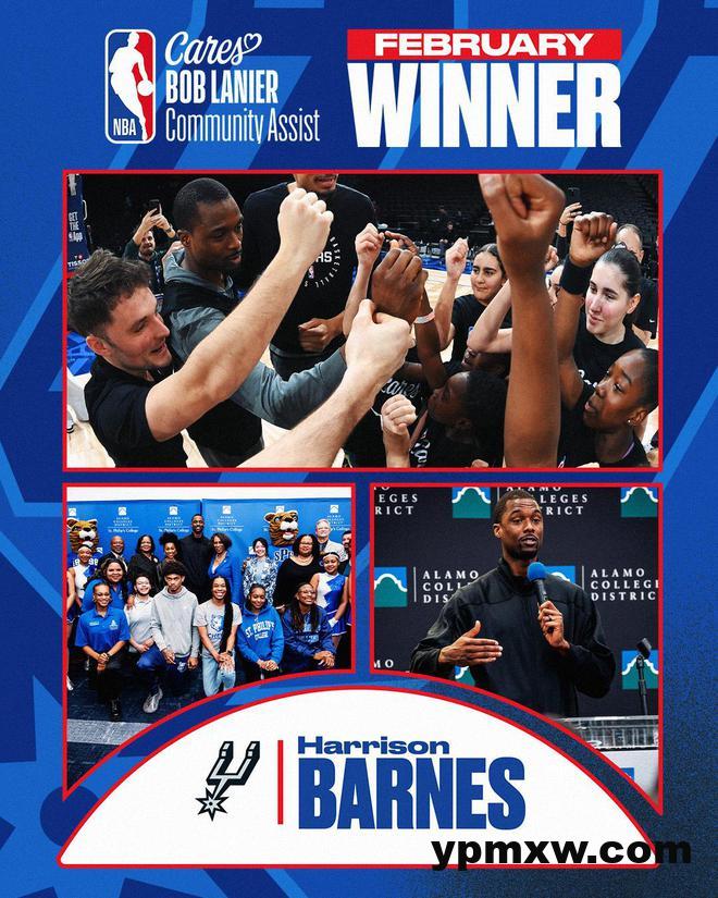 圣安东尼奥马刺队前锋哈里森-巴恩斯被评为2月份的NBA“鲍勃-兰尼尔”社区关怀援助奖(Bob Lanier Community Assist Award)得主。巴恩斯和他的妻子布列塔尼向阿拉莫承诺项目(AlamoPROMISE)捐赠了25万美元,该项目为符合条件的贝萨县学生支付学费和杂费。