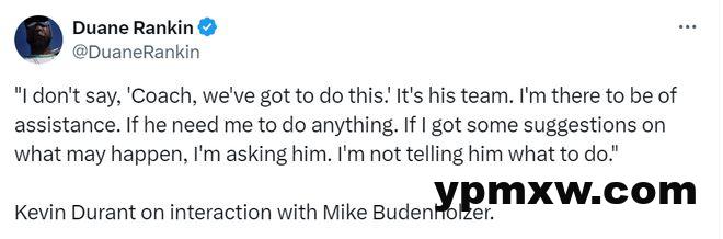 杜兰特一脸平静地回应道:“我不会说,‘教练,我们必须得这么做’。这是他的球队。我在这儿是提供协助的。要是他需要我做任何事(我都会帮忙)。要是我对可能发生的事情有一些建议,我会询问他,而不是告诉他该怎么做。”