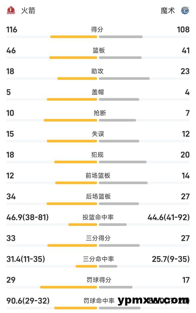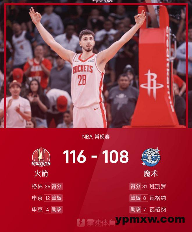 末节比赛,比塔泽飞身空接暴扣,布莱克上下步挑篮。申京强攻内线得手,史密斯篮下勾手命中。范弗里特接球三分命中,申京罚球线腹地抛射打成2+1。范弗里特罚球得分,约瑟夫抛投追分。申京弧顶发炮,瓦格纳抛射命中。火箭将分差扩大至两位数,双方胜负失去悬念,最终火箭战胜魔术取得8连胜。