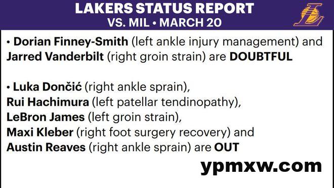 北京时间3月21日,湖人官方更新了今日对阵雄鹿的伤病名单,东契奇(右脚踝扭伤)、八村垒(左髌腱炎)、詹姆斯(左腹股沟拉伤)、克勒贝尔(右脚手术恢复)、里夫斯(右脚踝扭伤)将缺席比赛。芬尼 – 史密斯(左脚踝伤势管理)和范德比尔特(右腹股沟拉伤)也是大概率缺阵的状态。这意味着湖人预计七名球员不会出战雄鹿,冲击季后赛很重要,但保持健康仍是首要任务。
