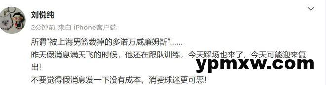 对此,媒体人“刘悦纯”发文表示,所谓“被上海男篮裁掉的多诺万·威廉姆斯”……昨天假消息满天飞的时候,他还在跟队训练,今天踩场也来了,今天可能迎来复出!不要觉得假消息发一下没有成本,消费球迷更可恶!
