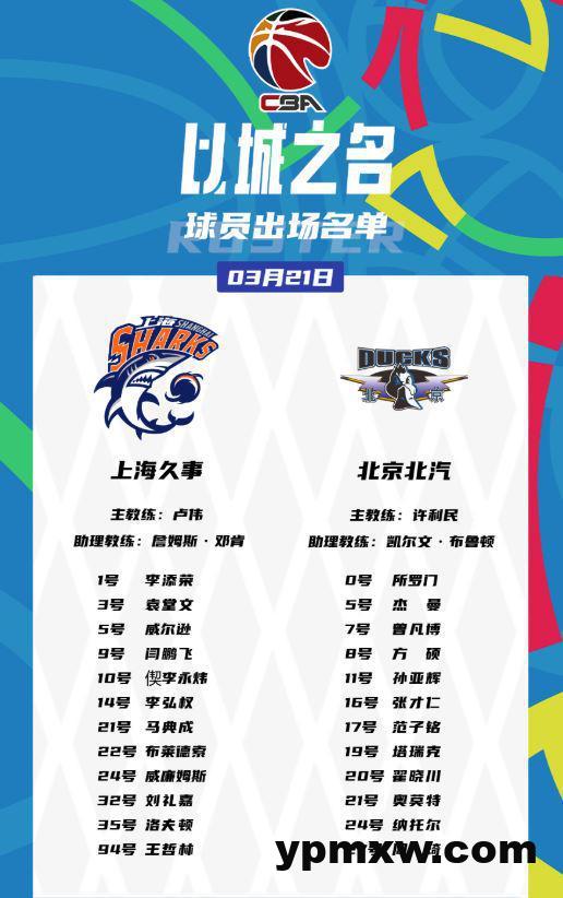 雷速体育3月21日讯 CBA常规赛继续进行,上海坐镇主场迎战北京。赛前两队大名单已经揭晓,以下是两队大名单具体情况: