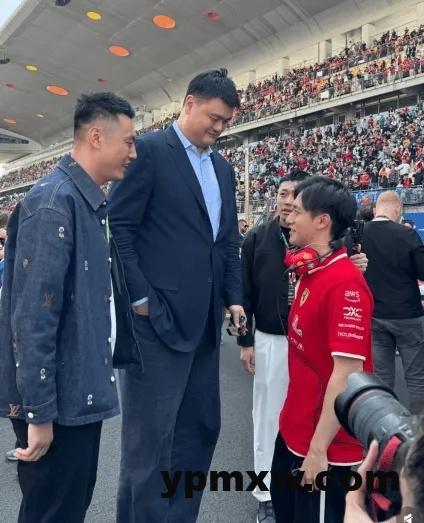 姚明和翟晓川和F1赛场中国选手周冠宇亲切交谈。周冠宇目前在法拉利车队担任储备赛手。